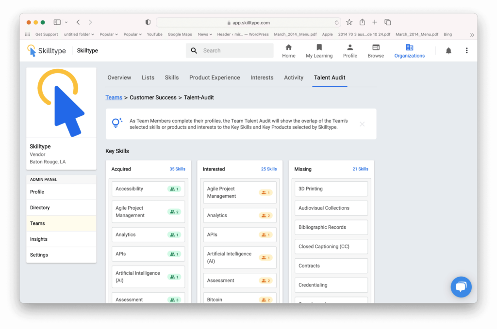 Welcome to Skilltype version 1.27, which includes a Team Talent Audit that shows Team Managers the overlap of a team’s skills, product experience, and interests with the key skills identified by each organization. The Team Talent Audit illustrates the unique contribution each team makes to the library organization. Team Managers can easily view skills that may be missing from the library overall to align staff learning goals with library needs.