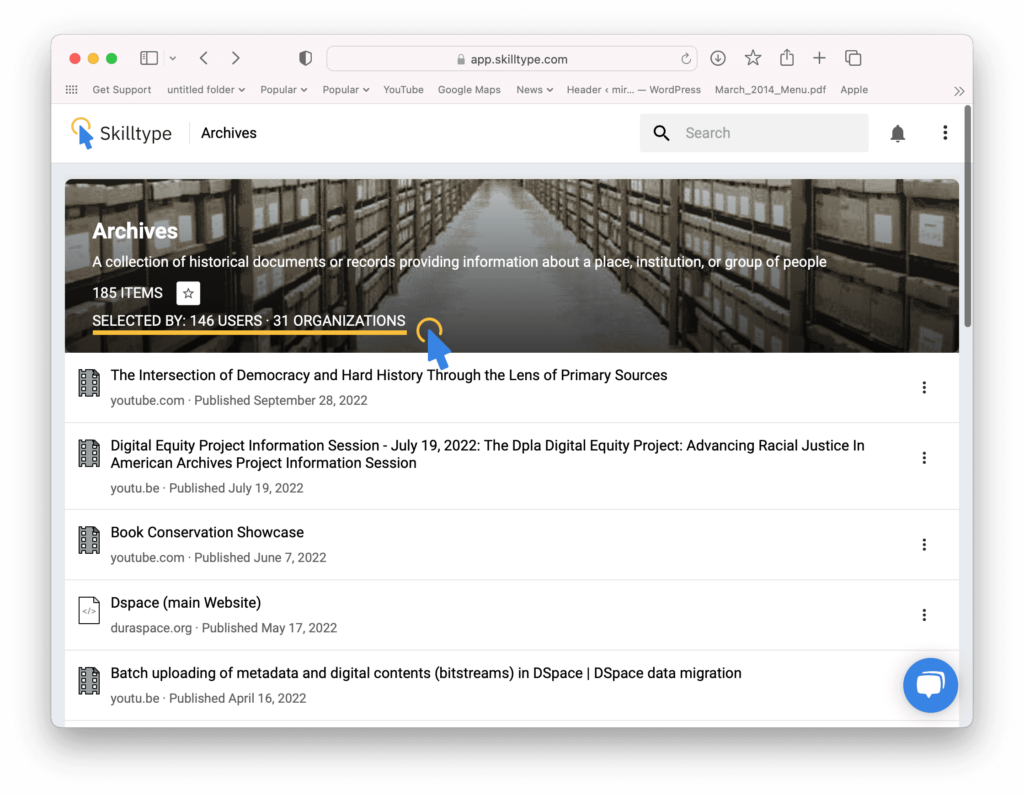In version 1.27, the number of users or organizations which have selected a tag is now visible. In this example, 146 users and 31 organizations have selected the skill ‘Archives’.