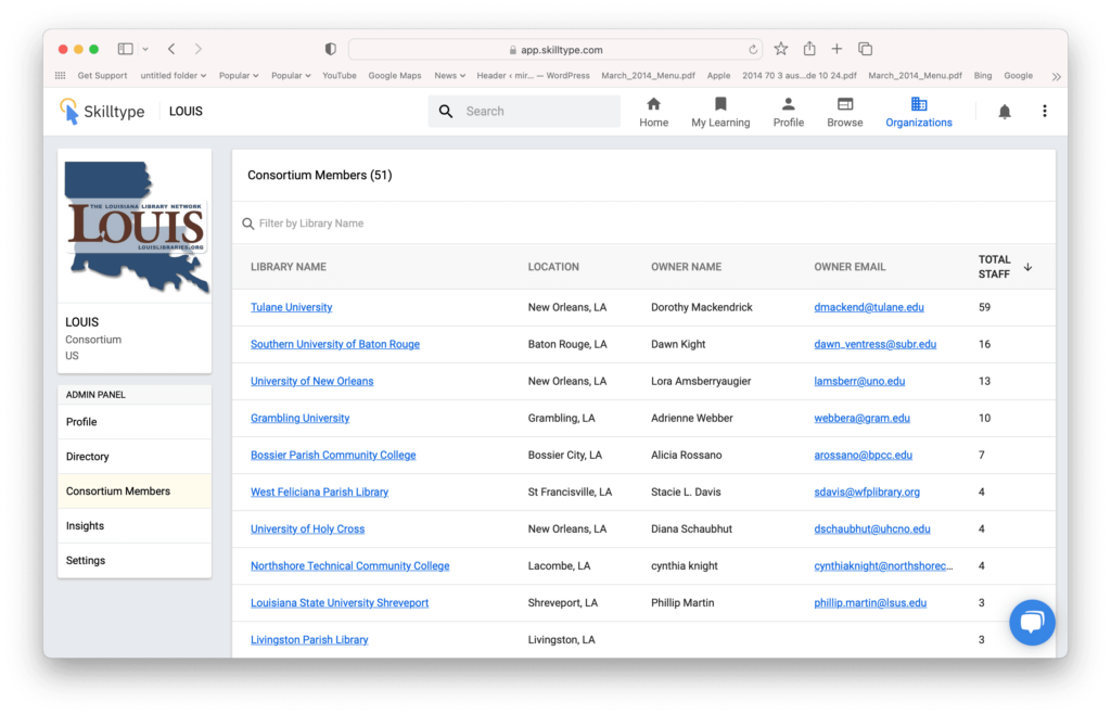 Skilltype’s improved Consortium Members list provides leaders with quick access to key contacts and details about member libraries.