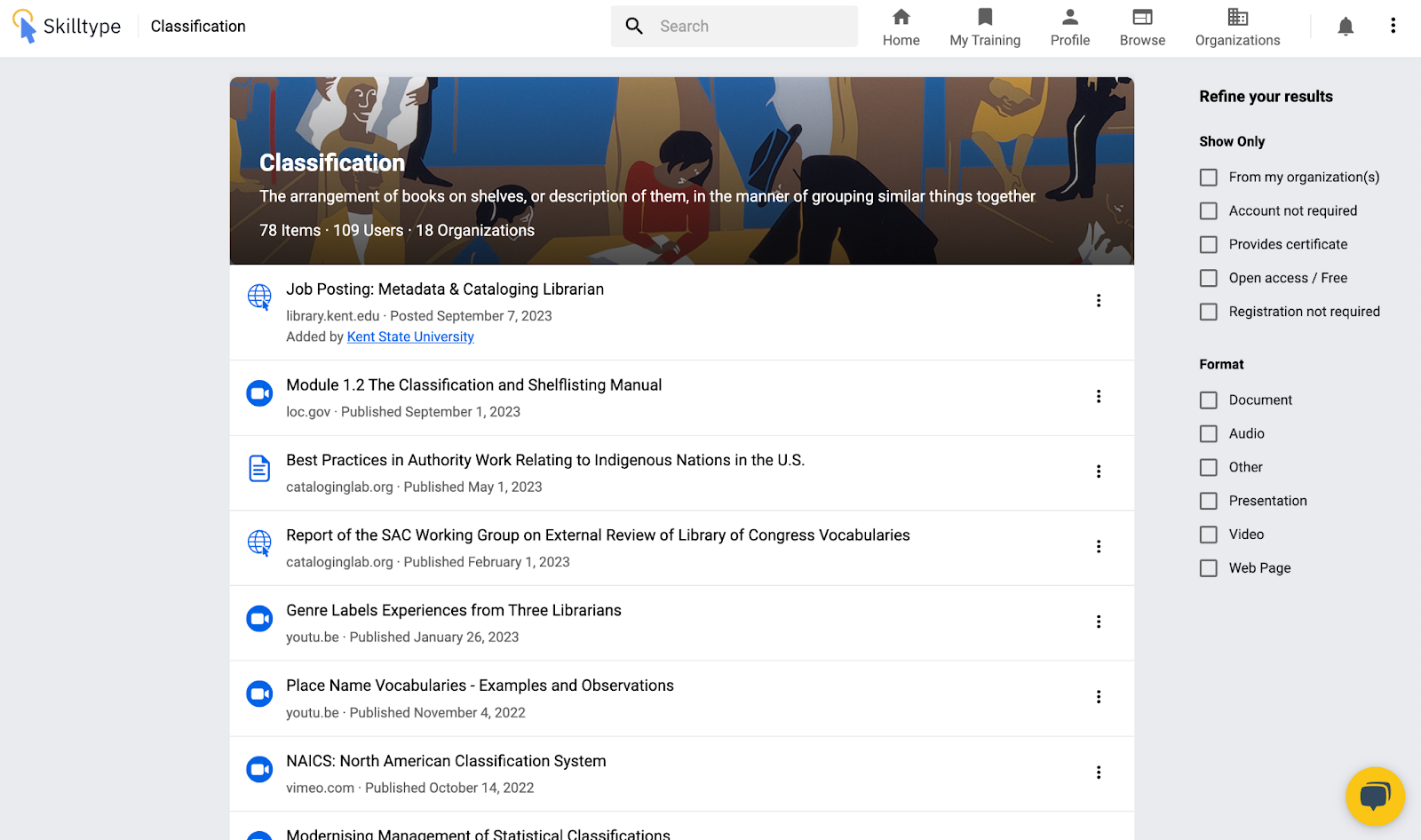 We’ve integrated links to 200 courses from Library Juice Academy in response to customer feedback. The Library Juice Academy courses linked through Skilltype provide customers with the opportunity to register for live courses led by industry practitioners. Students who register for and complete Library Juice Academy courses will be eligible for certificates equivalent to continuing education units. While these new resources have broad applicability to information professionals across different settings, their emphasis on skills development significantly enhances professional competence and performance.