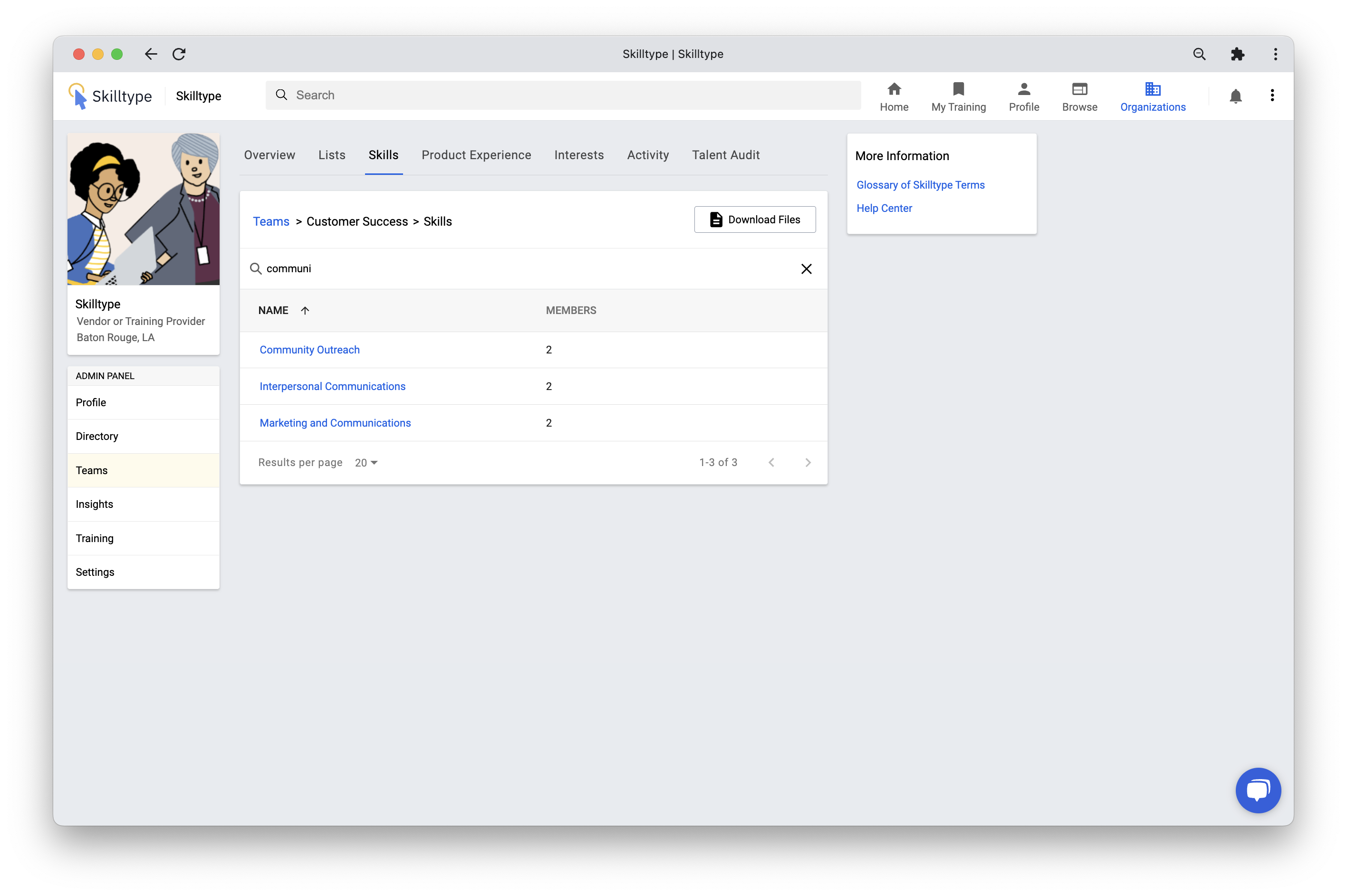 • The Members column shows the number of organization members with the skill, product or interest.