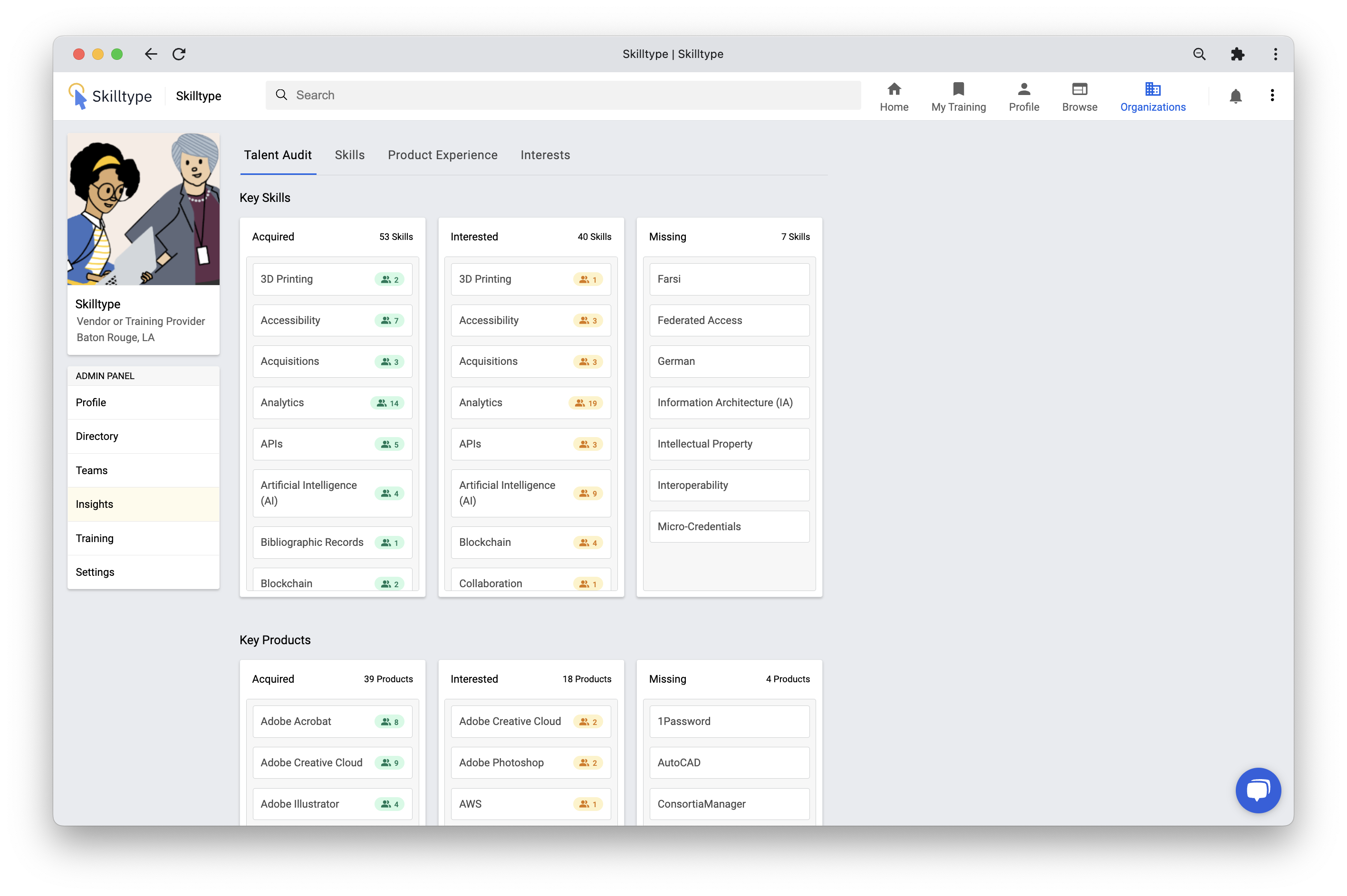 • Scroll down to see a similar graph of Product Experience below your organization’s Acquired, Interested or Missing skills.