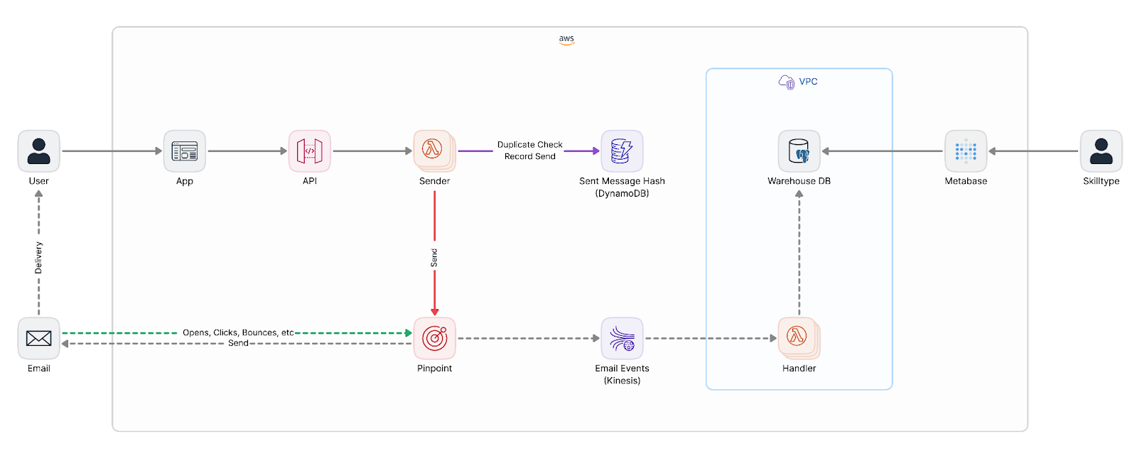Sending transactional emails to our users is a critical part of our business and a task that Skilltype’s engineering team takes to heart. We use a mixture of stateful, stateless, and event-driven components to ensure emails reach our customers. As well as, capture just the right amount of analytics to aid our Customer Success team in troubleshooting deliverability issues.